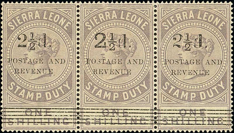 2½d. on 1/- dull lilac, a strip of three comprising Types 8+10+11, unused with large part original gum, a fine and scarce multiple. S.G. 63, 65, 66; £1610. Photo