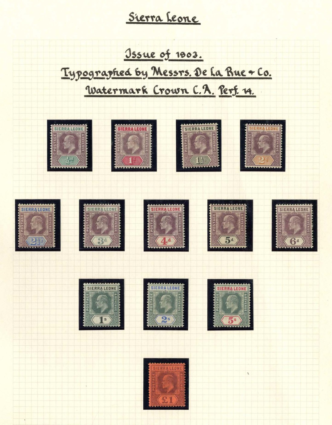 1903 CA ½d. to £1 set of thirteen, fine, 1904-05 MCA ½d. to £1 set of thirteen (2d. and 4d. with light gum staining) plus additional 3d. and 4d. (lightly gum toned) showing watermark inverted, mounted mint and 1907-12 MCA ½d. to £1 with both 1d. (2d., 5d. and 6d. gum toned), mounted mint. S.G. 86-111, £1474