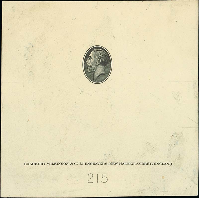 1932 Bradbury Wilkinson Head die proof as used for the high values, in black on wove paper (69x68mm.) with printer's imprint and die number "215" at foot, a touch of soiling in places though fine. Photo