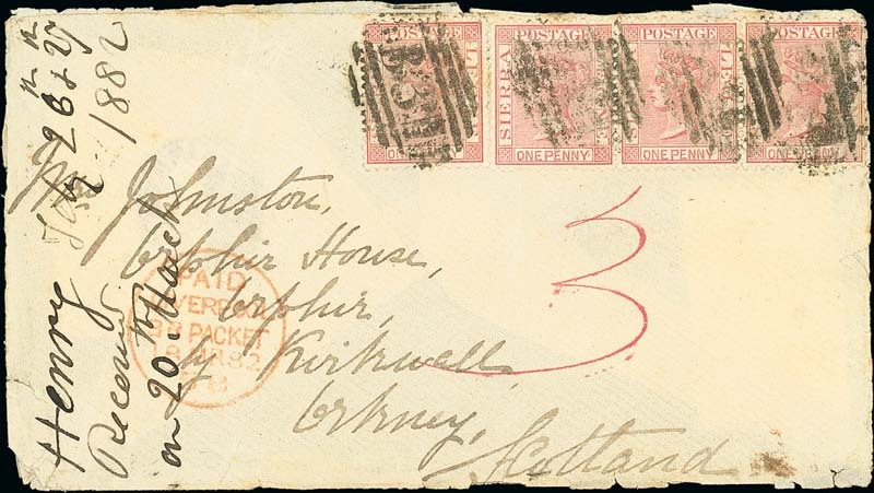 1882 (Feb.) envelope (opened-out) to Orkney, bearing 1876 1d. rose-red (4) each cancelled by slightly heavy "B31", showing manuscript "3" in red, "paid/liverpool/br. packet" transit d.s. in red (18.3) and, on reverse, despatch c.d.s. overstruck by arrival d.s. (20.3); the envelope with recipient's notation at left and with some minor peripheral faults. Photo