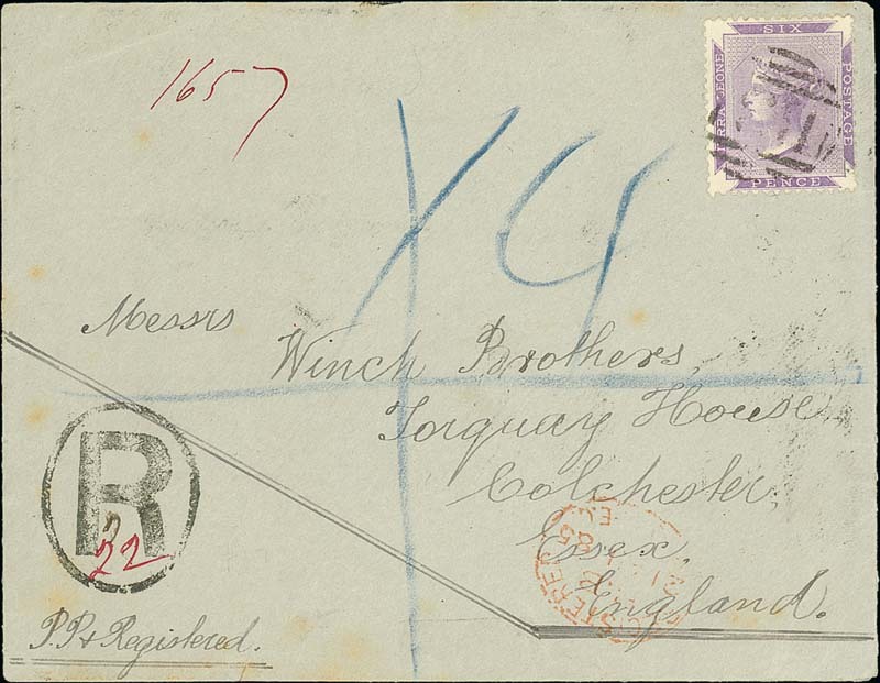 1885 (2 Aug.) Winch Bros envelope registered to England, bearing 1885 6d. dull violet cancelled "B31", showing "R" in oval and, on reverse, despatch, Liverpool (21.8) and arrival datestamps. Photo