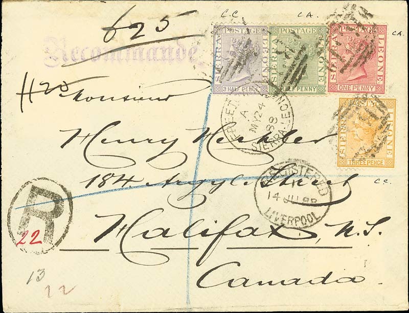 1888 (24 May) envelope registered to Canada, bearing 1884-91 ½d. dull green, 1d. carmine, 1½d. pale violet and 3d. yellow, all tied by "B31" obliterator, showing "R" in oval, Freetown despatch and Liverpool (14.6) transit datestamps and, on reverse, Halifax arrival c.d.s. (24.6). A colourful four-colour franking. Photo