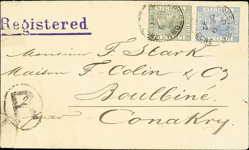 1892 (9 Dec.) envelope registered via Conarky to Boulbiné, Guinea, bearing 1884-91 2d. grey and 2½d. ultramarine tied by Freetown c.d.s. and showing "R" in oval; envelope with faults at left, mostly confined to reverse. Photo