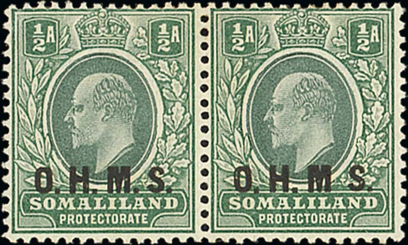 1904-05 CA ½a. dull green and green pair, the right stamp with no stop after "m", and two singles, both with small stop after "m", fine mint. B.P.A. Certificate (1977) for pair. S.G. O10/10a, £300+. Photo