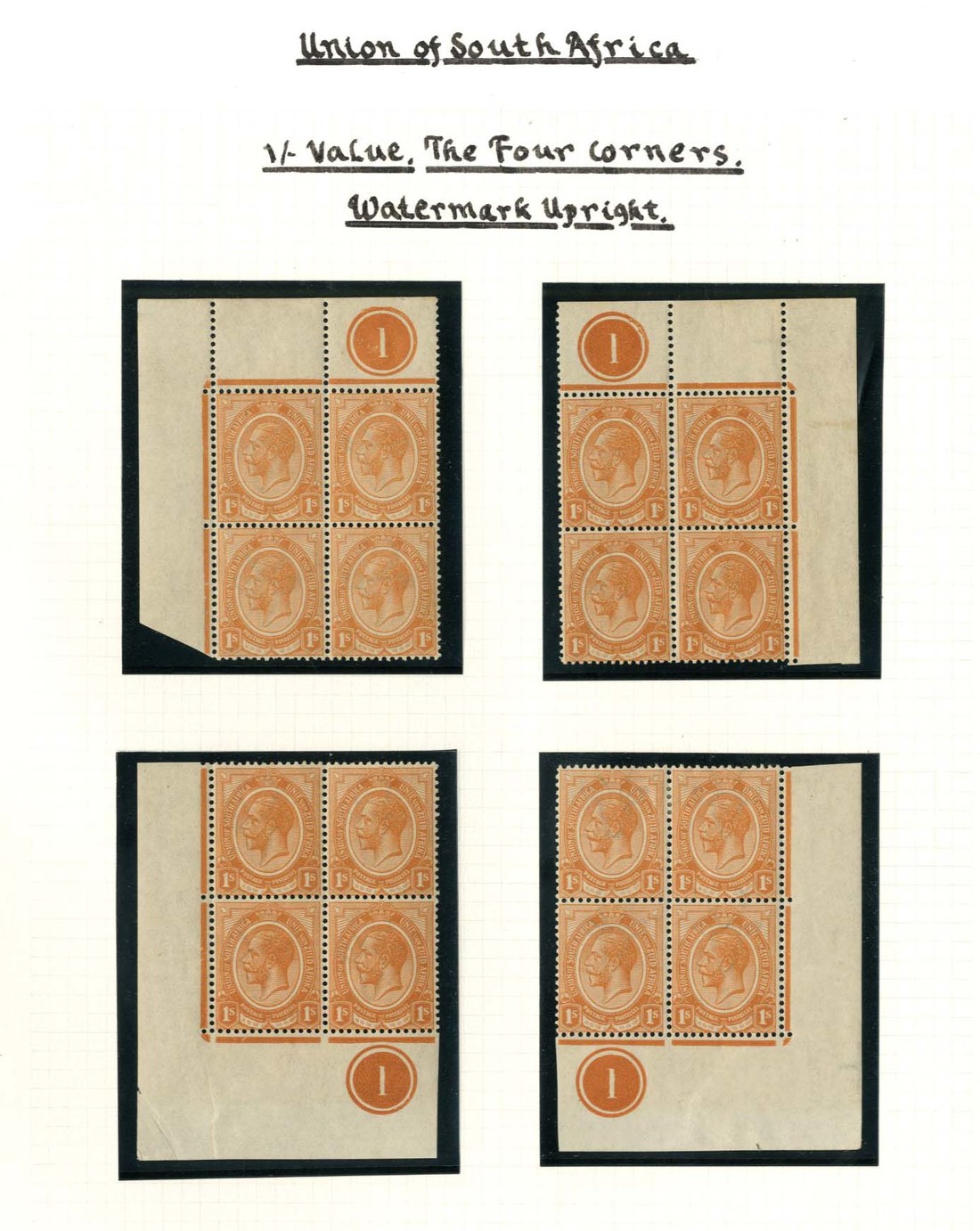 1/- orange, blocks of four from the four corners of the sheet, one set with watermark upright, the other with watermark inverted; lower left block with inverted watermark with a rounded corner, otherwise fine mint