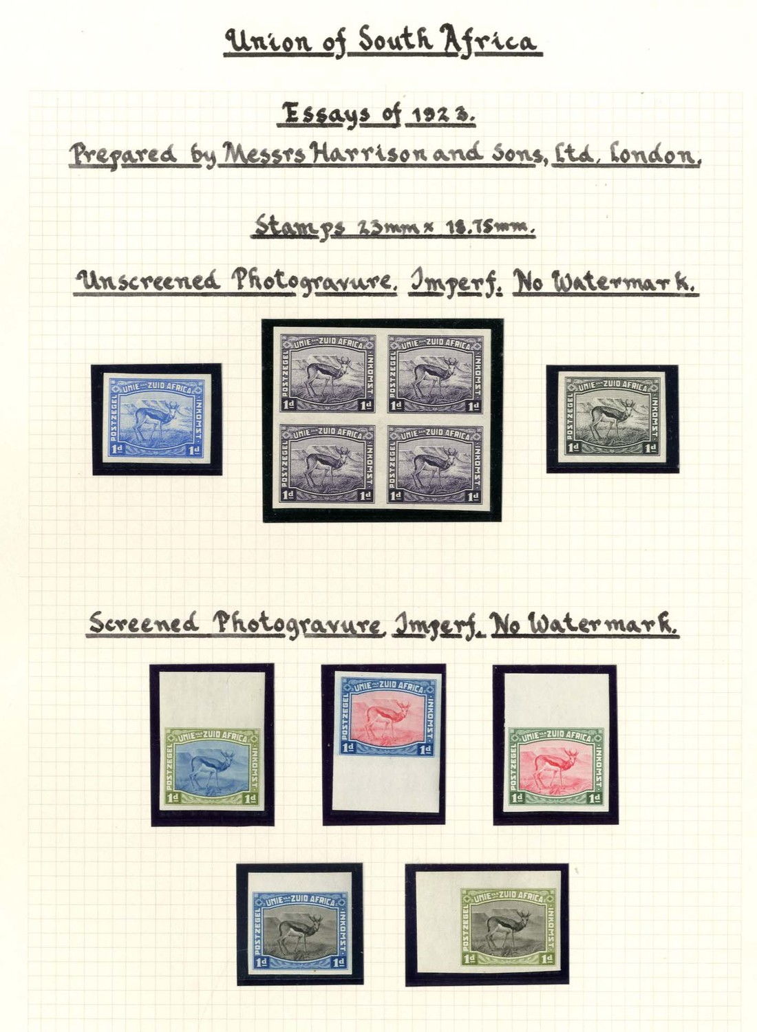 1923 Harrison Springbok 1d. essays, a collection comprising imperforate unscreened block of four in deep violet and singles in blue and black, screened in five different combinations and small design block of ten (5x2) with ruled lines and overprinted "Muster", perforated in three different colour combinations (one in a block of eight), mono-coloured in blue (2) and carmine, all no watermark, and watermark Trefoil carmine blocks of four (3), one with flaw on "P" of "Postzegel"; fine and an attractive group