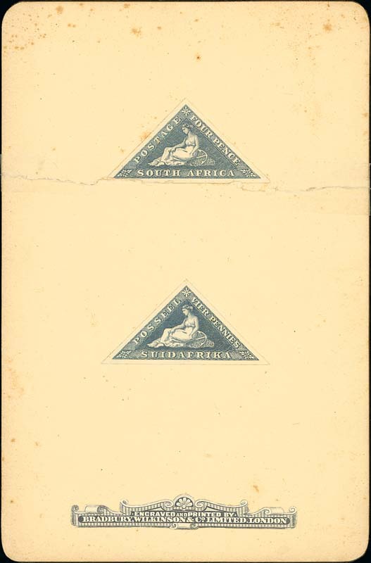 1926 Triangular 4d. grey blue, imperforate proofs in deep grey-blue in both languages, affixed to Bradbury Wilkinson card (117x64mm.); heavy horizontal crease just affecting the base of the English proof, and the card with a little foxing in places, nevertheless a very rare pair; also issued stamps (13) with two blocks of four and one perforated privately. Photo