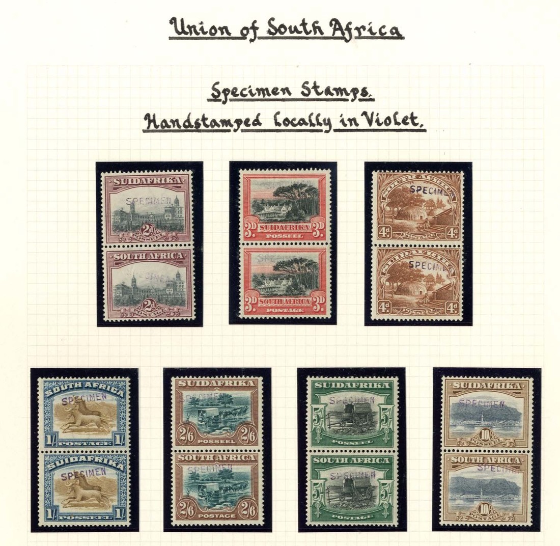 2d. to 10/- set of seven in vertical pairs, all handstamped "specimen" in violet, fine mint