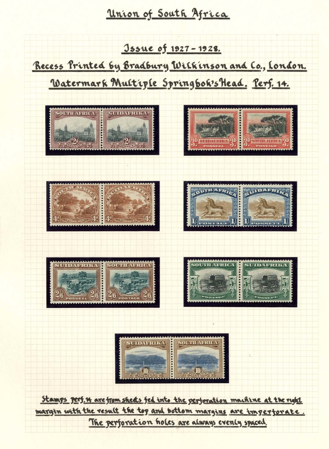 Perf. 14 set of seven in horizontal pairs with additional 10/- with aniline ink colours, mint, 2d. used pairs (2), one showing split "d" in "2d" and one with fractionally smaller frame; generally fine. Cat. £850+