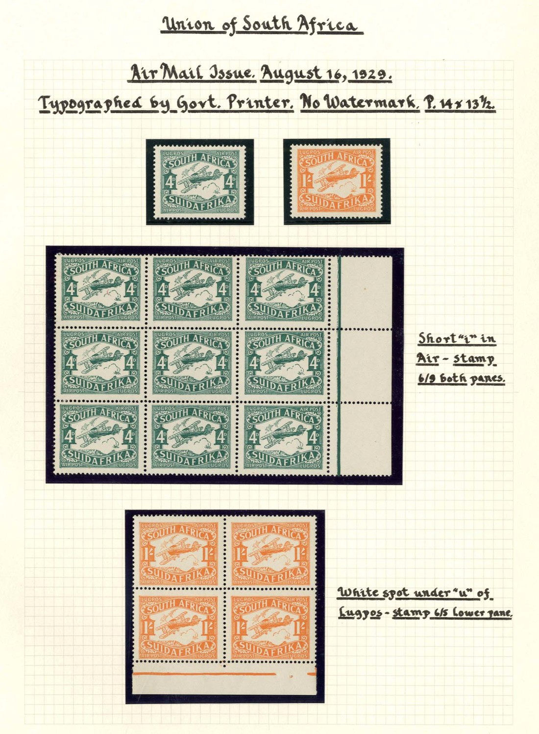 1929 Air 4d. and 1/- plate proofs in black on glazed paper, fine. Also issued 4d. (10 with a marginal block of nine) and 1/- (5 with a marginal block of four), both multiples exhibiting a minor variety, fine mint. Photo for proofs