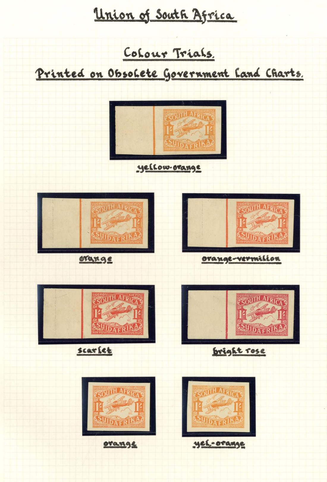 — 1/- plate proofs in yellow-orange (2), orange (2), orange-vermilion, scarlet and bright rose, all printed on reverse of obsolete government land charts, fine. Photo