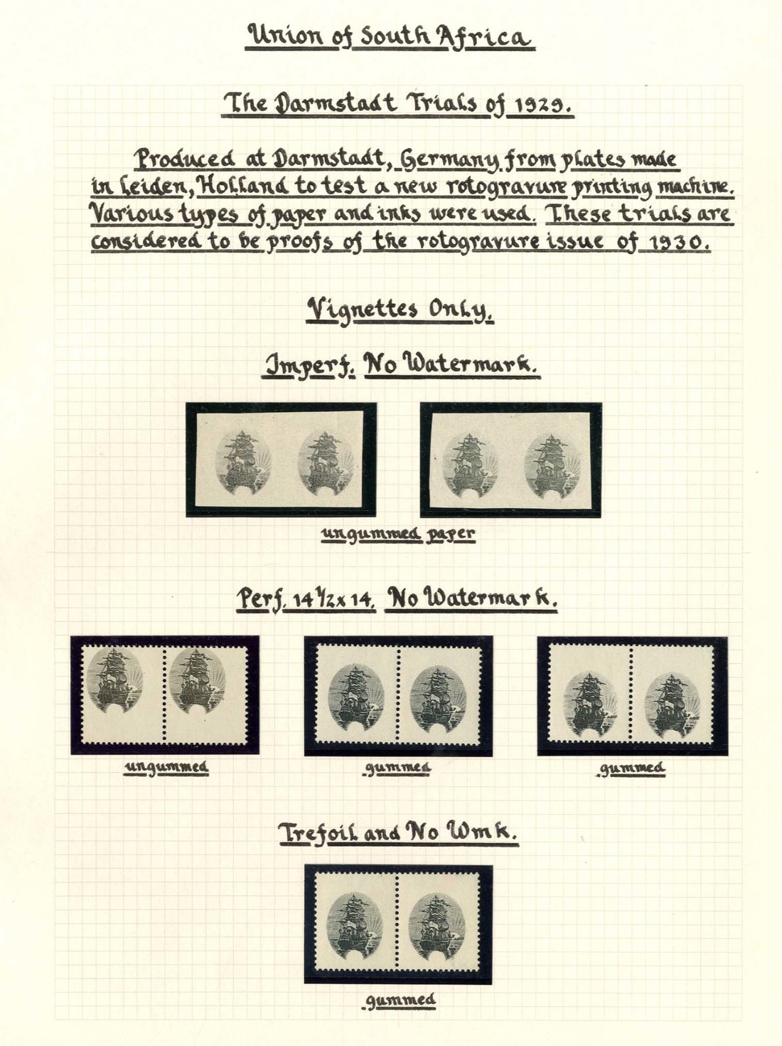 1929 1d. Darmstadt trials, a specialised study neatly mounted and written-up on pages, comprising frame only imperforate pairs (2), blocks of six and nine, frame only perforated pairs (4) and a strip of twelve with or without Trefoil watermark, frame only imperforate pairs (3) and marginal block of twelve and perforated pairs (4) with or without watermark, and complete design, perforated pairs (5) and blocks of four (5) without watermark, a strip of twelve with or without Trefoil watermark, pairs (2) and a block of four with Trefoil watermark, and pairs (2) with Springbok watermark, some ungummed. A fine representation of these interesting stamps. (119)