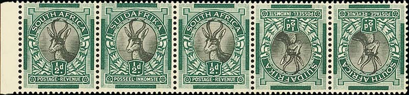 ½d. black and green marginal strip of five, stamps three and four forming a tête-bêche pair, fresh mint with a single hinge remainder, fine mint. Scarce. S.G. 42a, £1,400. Photo