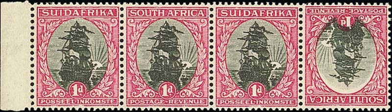 1d. black and carmine Type I marginal strip of four, the right-hand pair variety tête-bêche, fine mint. Scarce. S.G. 43a, £1,400. Photo