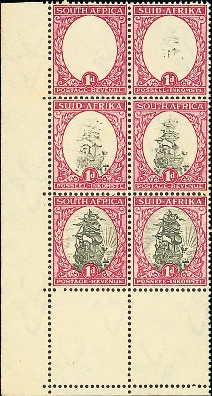 1d. grey and carmine with watermark upright, a lower left corner block of six (2x3), the top pair with vignettes virtually absent and the middle pair with them partially so due to a dry print, fine unmounted mint. Photo