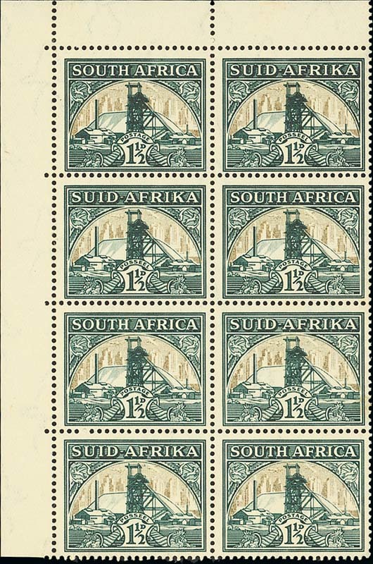 1½d. green and bright gold watermark inverted upper right corner block of eight (2x4), Row 3/2 variety shading omitted from mine dump and to a lesser degree on both stamps in row 4, fine unmounted mint. S.G. 57/57a. Photo