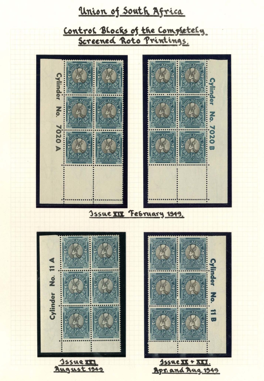 1947-54 Screened roto printings, a collection of cylinder blocks, comprising ½d. ("31" omitted), 1d. (3), 2d. (used), 3d., 6d. (3), 1/- (3), 2/6d. (3) and 5/- (both colours) in blocks of four, ½d. (6) and 3d. blocks of six, ½d. (2) blocks of eight an 4d. block of twelve