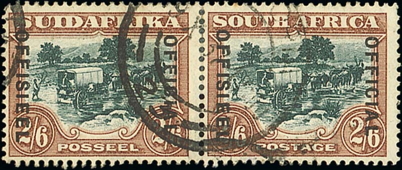 2/6d. green and brown with watermark inverted and lines 21mm. apart, a horizontal pair with part double-ring datestamp; some perfs. severed and strengthened, and a little creased though very rare. S.G. O18aw, £750. Photo