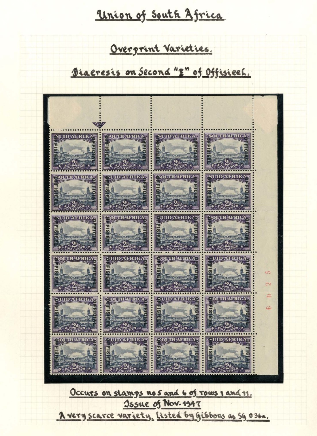 1947 2d. slate and deep lilac upper right corner block of twenty-four with sheet number "6025", variety diaeresis over second "e" of "offisieel" (R.1/5-6), fresh mint with the stamps remaining unmounted; folded between the second and third horizontal rows, otherwise fine. A rare positional multiple. S.G. O36/O36a, £700+