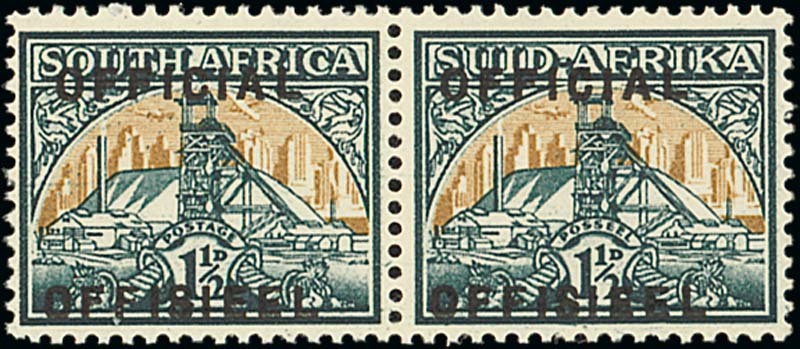 1950 medium format 1½d. blue-green and yellow-buff horizontal pair with overprint printed horizontally, fresh unmounted mint. See note after S.G. 35, £950. Murray Payne Certificate (2006). Photo