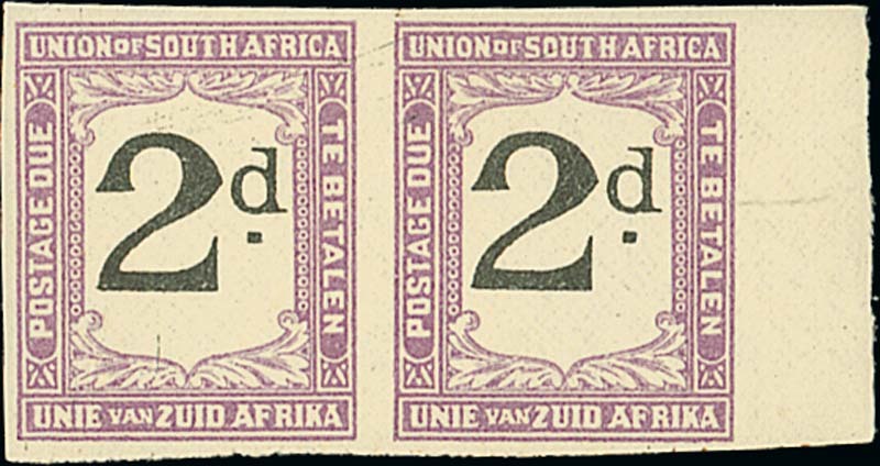 — 2d. black and violet horizontal marginal pair from the right of the sheet, variety imperforate, fine mint with yellowish gum. S.G. D14a, £400. Photo