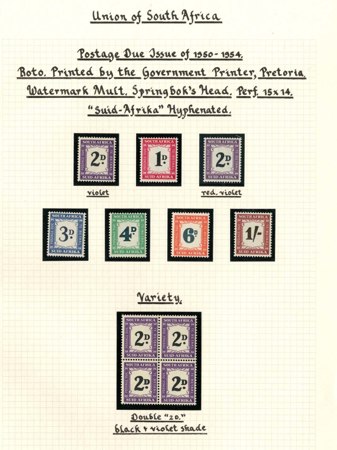 1948-49 set and 2d. with thick double "d" in a block of four, 1950-58 set with thick double "d" in three shades in blocks of four or twelve, 3d. with split "d" in pair (light foxing) and 6d. pair with value misplaced to top, all mint and the set of six with 1d., 2d. (2) and 6d. shades in used blocks of four, and 1961 set mint; generally fine. S.G. D34-D44
