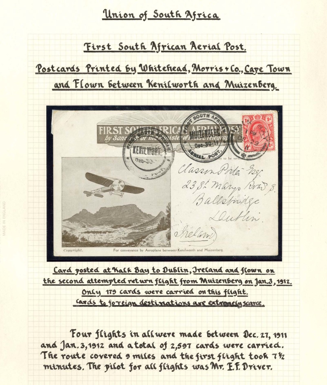 1911 (29 Dec.) First South African Aerial Post illustrated card to Ireland flown on the second attempted return flight from Muizenberg, bearing Transvaal 1d. cancelled at Kalk Bay and with despatch and arrival flight cachets alongside; a scarce overseas usage