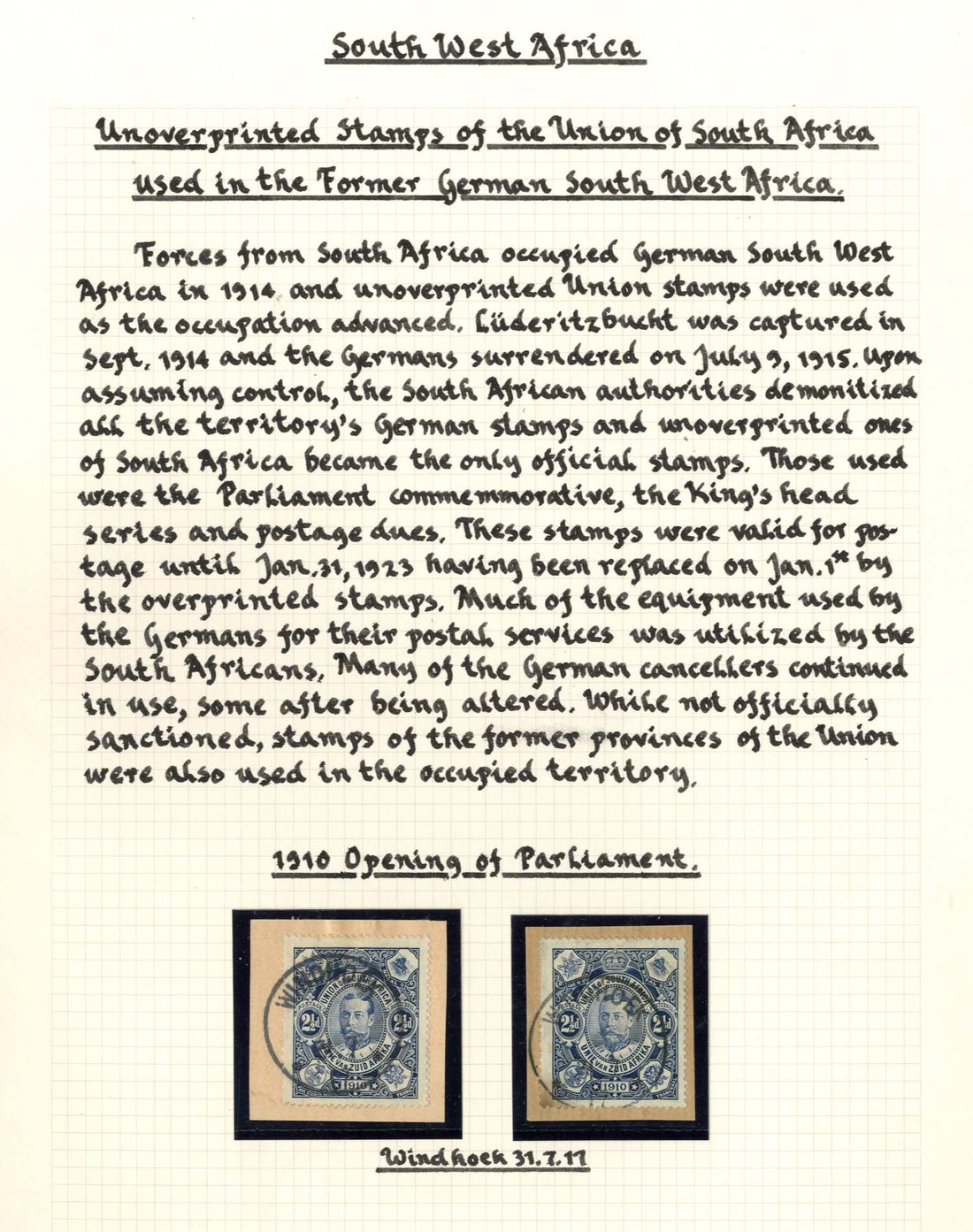 A collection on leaves, including 1910 2½d. (2), 1913-24 range of values (109) with 1½d. tête-bêche pairs (2, one interpanneau), 1/3d. pair, 10/- (10 with a block of four) and £1; also Natal 2d. and 4d., Orange River Colony 1d. block of six and Transvaal 2½d. (2), mainly on pieces, predominantly Windhoek though with various other offices included. A fine and attractive lot