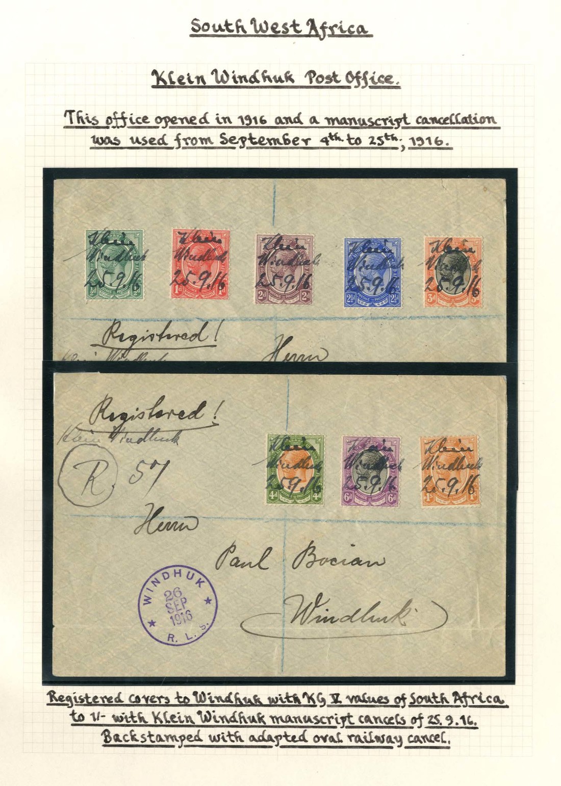 1916 (25 Sept.) envelopes (2) ex the same correspondence registered from Klein Windhuk to Windhoek, between them bearing 1913-24 ½d., 1d., 2d., 2½d., 3d., 4d., 6d. and 1/-, all cancelled "Klein Windhuk 25.9.16" in manuscript and with "windhuk r.l.s." c.d.s. in violet at foot; a colourful and attractive pair