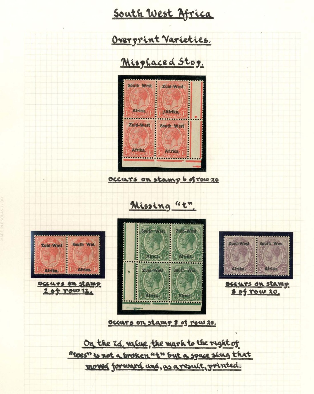 ½d. lower left corner block of four, 1d. and 2d. horizontal pairs, one in each showing "Wes" for "West" with the 2d. showing space slug after "Wes", and 1d. lower right corner block of four with one showing "Af.rica" for "Africa.", fine mint. S.G. 1a, 2b, 2c, 3b, £815