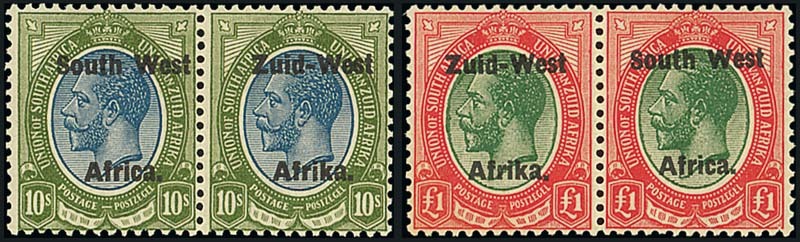 5/-, 10/- and £1 horizontal pairs, fresh mint; the 5/- with horizontal bend at foot, the 10/- and £1 fine. S.G. 13-15, £1,660. Photo for 10/- and £1