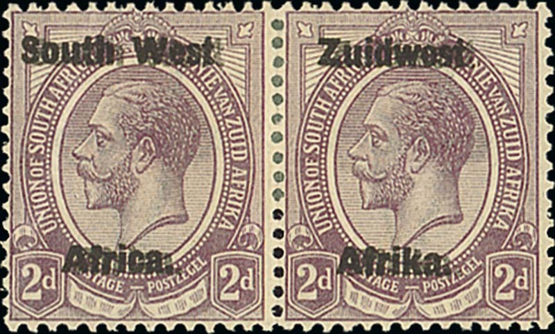 2d. dull purple horizontal pair, variety overprint double with the second overprint lighter, fresh mint; a few separated perfs. at centre strengthened. Rare. B.P.A. Certificate (1953). S.G. 18a, £1,000. Photo