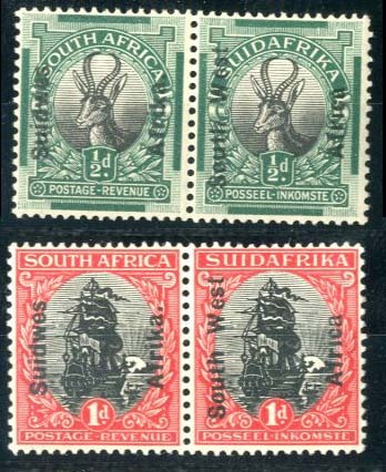 1927 Transposed overprints, ½d. and 1d. horizontal pairs with one in each showing variety "Africa" without stop, fresh mint. S.G. 45a, 46a, £460