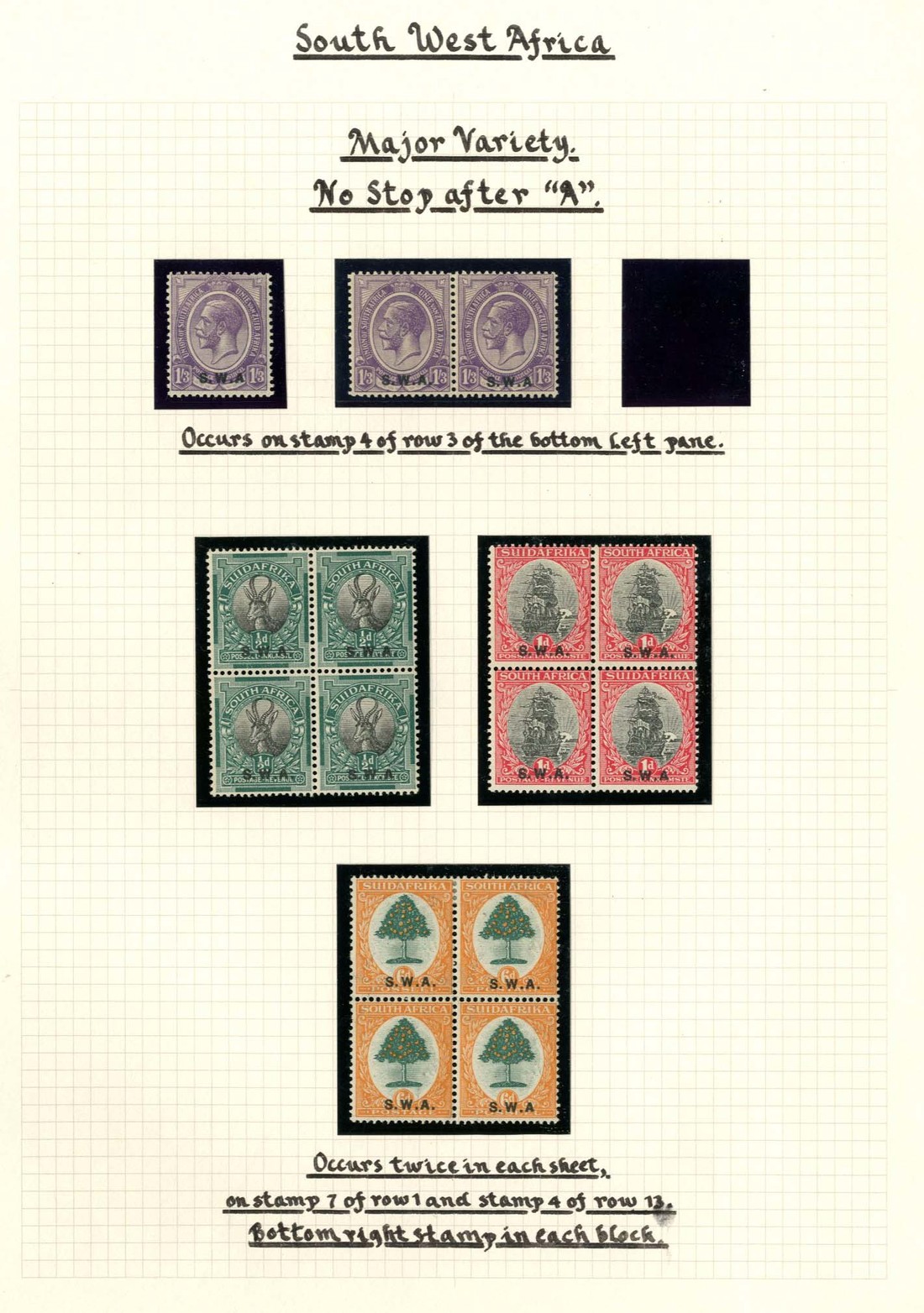 1/3d. pair and a single, Pictorial ½d., 1d., 2d., 3d. and 6d. blocks of four, 4d., 2/6 and 5/- pairs, one in each with variety without stop after "A" (tiny specks remaining on 2/6d. and 5/-), good to fine mint. Cat. £1,000+