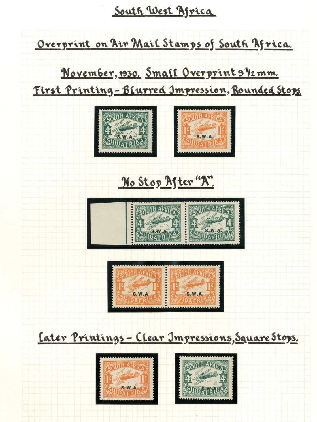 1930 (Nov.) Air selection comprising first printing 4d. and 1/-, 4d. and 1/- pairs with variety no stop after "S.W.A." and 4d. (2) and later printings 4d. and 1/-, 1/- no stop pair with a tone patch, otherwise fine mint; also 4d. pair with Official 1d. pair on 1931 (Dec.) flight cover to Pretoria. S.G. 70, 71