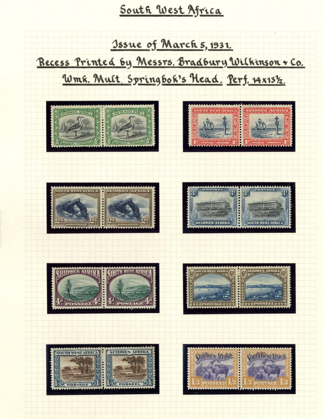 1931 Pictorial ½ to 20/- set of fourteen in horizontal pairs, 3d. and 10d. Air pairs on 1932 (27 Jan.) "First Flight South Africa-Europe" from Keetmanshoop to Germany, 3d. block of four on 1935 first flight envelope registered from Windhoek, 2/6d. and 5/- horizontal pairs, 10/- and 20/- blocks of four, used; 20/- mint pair with a crease though generally fine. S.G. 74-87, £660+