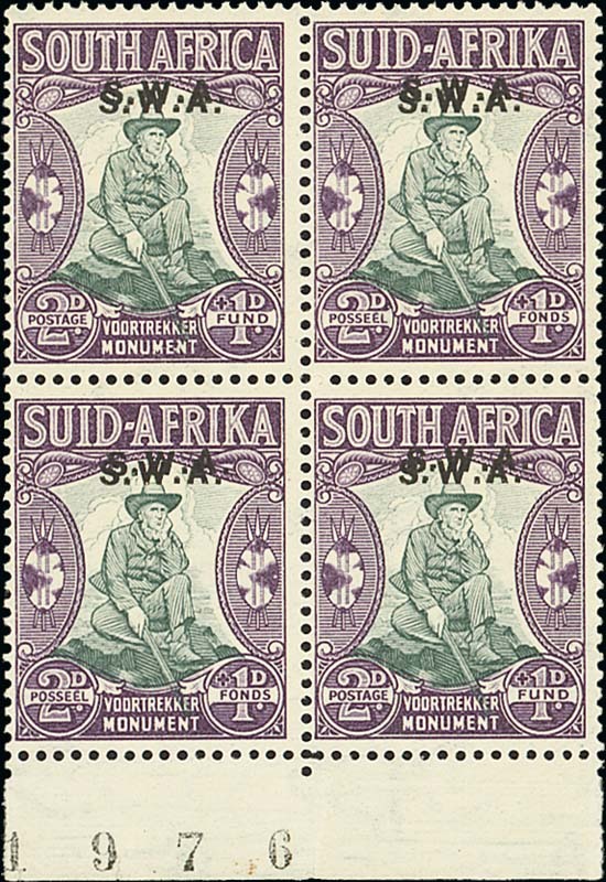 2d.+1d. grey-green and purple marginal block of four with sheet number, variety overprint double, fresh unmounted mint; minor creasing in margin, otherwise fine. S.G. 94b, £900. Photo