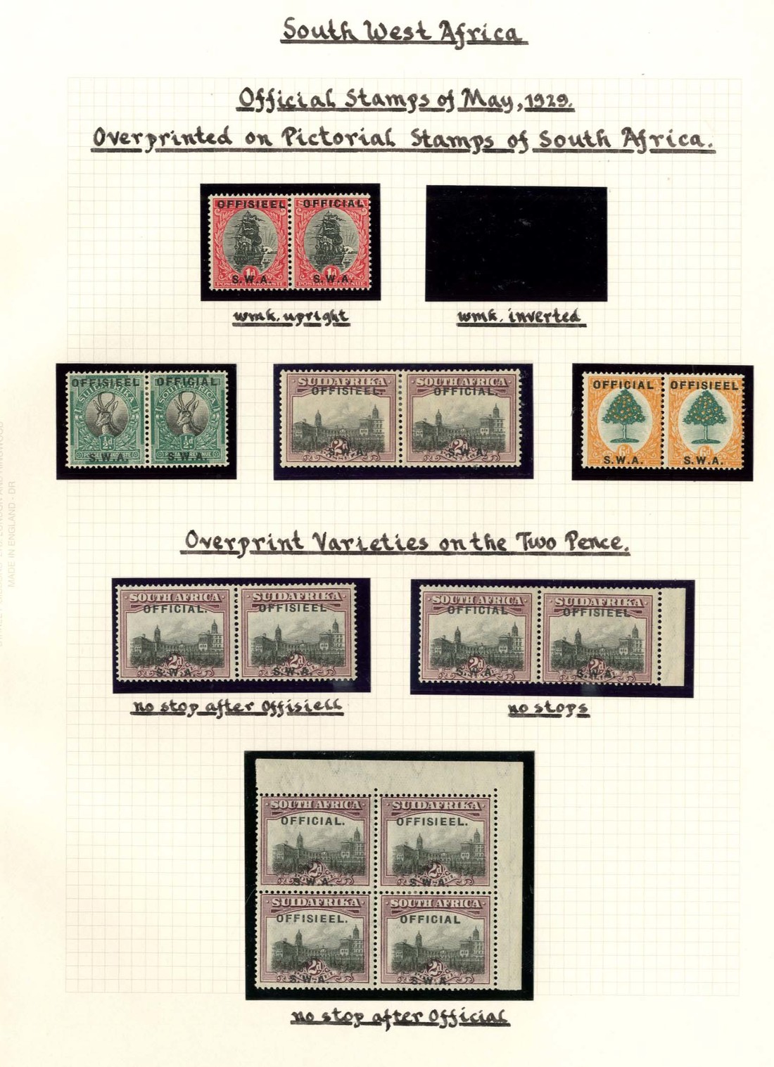1929 (May) and (Aug.) sets of four and the six 2d. no stop varieties all in horizontal pairs (one 2d. variety in a corner block of four), 1929 and 1932 blue-green OHMS envelopes, the first with August ½d. and 1d. blocks of four and 6d. pair, the second bearing May 6d. pair and 1931 Air 10d. registered on Windhoek-Kimberley first flight to London
