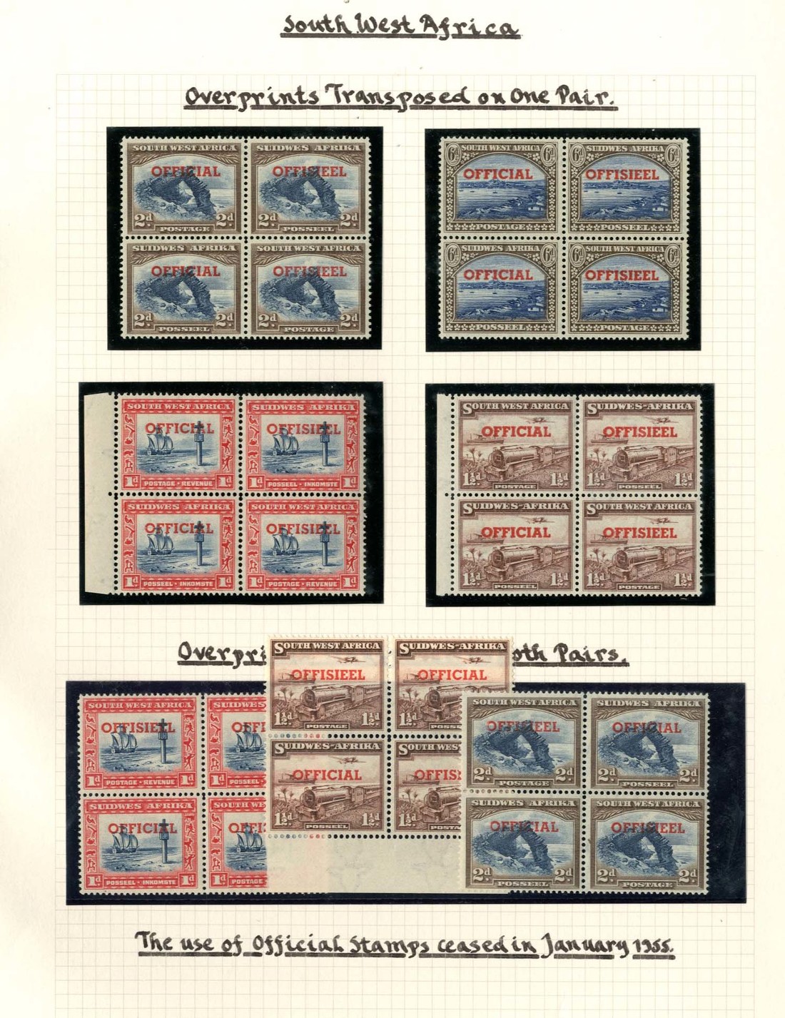 1951 1d., 1½d., 2d. and 6d. blocks of four including one transposed overprint pair, 1d., 1½d., and 2d. blocks of four with both pairs having transposed overprints, fine mint. S.G. O24-O27a, £779+