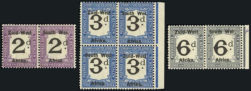 1923 (Jan.-July) Setting I, South Africa De La Rue printing, 2d. and 6d. horizontal pairs and 2d. block of four, the 3d. and 6d. with narrow sheet margins, all variety "Wes" for "West", mint with the 6d. unmounted. S.G. D3a-D5a, £870. Photo for all
