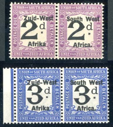 1923 (Jan.-July) Setting II, South Africa De La Rue printing, 2d. and 3d. horizontal pairs (3d. with narrow sheet margin at left), both variety "Afrika" without stop, mint; the 2d. pair gum toned, the 3d. lightly mounted. S.G. D11a, D12a, £430