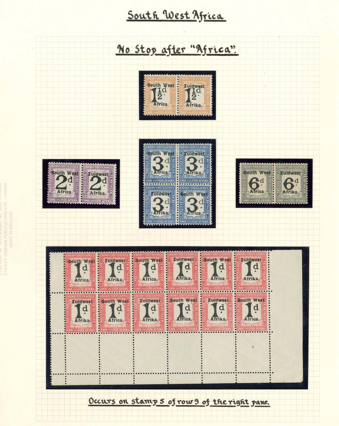 1923-26 Setting VI, South Africa Pretoria printing, 1d. block of twelve from the foot of the sheet with full sheet margins, 1½d., 2d. and 6d. horizontal pairs and 3d. block of four, all variety "Africa" without stop, mint; three with gum bends though of fine appearance. S.G. D28a-D32a, £545