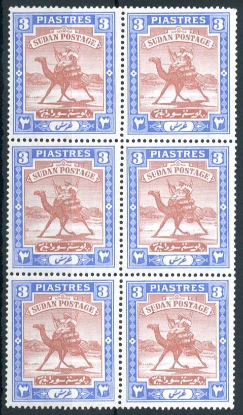 3p. red-brown and "new" blue, a perforated block of six (2x3) colour trials on gummed watermarked paper, one with tiny thin otherwise fine