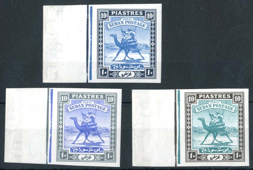 10p. imperforate colour trials (3) on gummed watermarked paper with margin at left, fine
