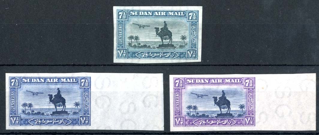 7½p. imperforate colour trials (3) in indigo and deep blue, indigo and reddish violet and in deep green and blue-green, all marginal on ungummed "SG" sideways watermarked paper, fine