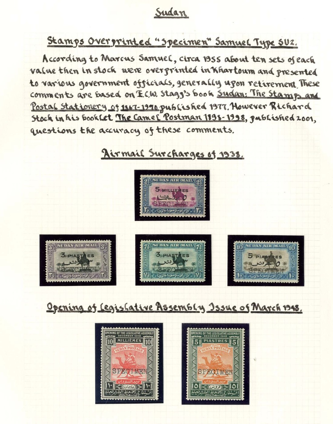 The set of four overprinted "specimen" (Type SU 2), fine mint; also 1948 Opening of Legislative Assembly 10m. and 15p. similarly overprinted. S.G. 74-77, 113-114