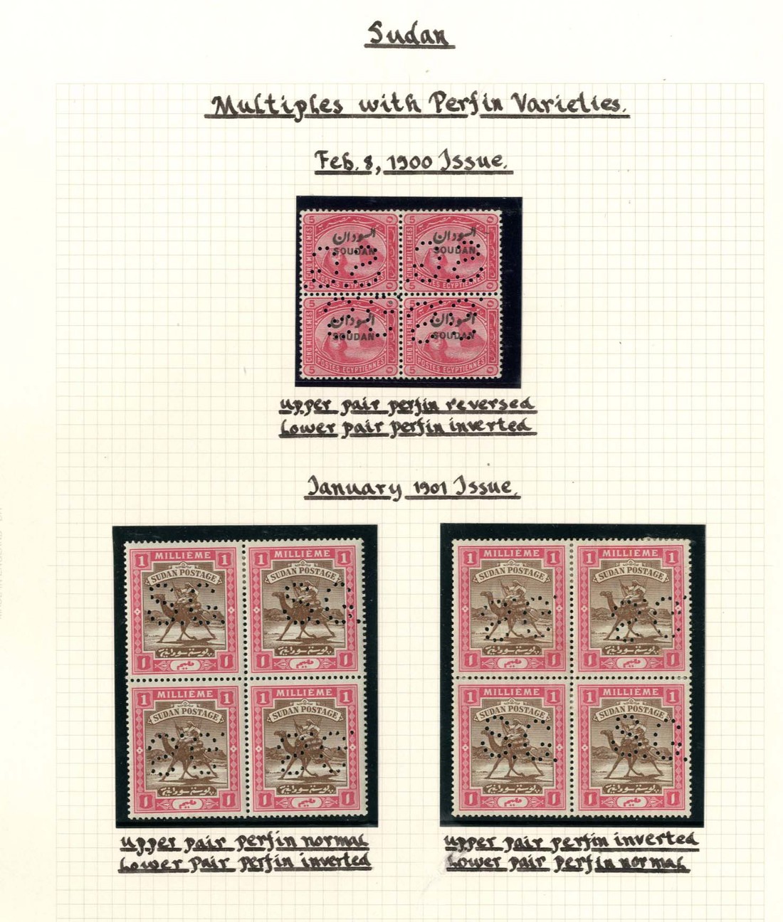 1900 (Feb.) 5m. block of four, the upper row with punctures reversed and the lower with punctures inverted, and 1901 (Jan.) 1m. blocks of four (2), one with the lower row of punctures inverted, the other with the upper row inverted, some hinge remnants, fine mint. S.G. O1-O2, £680