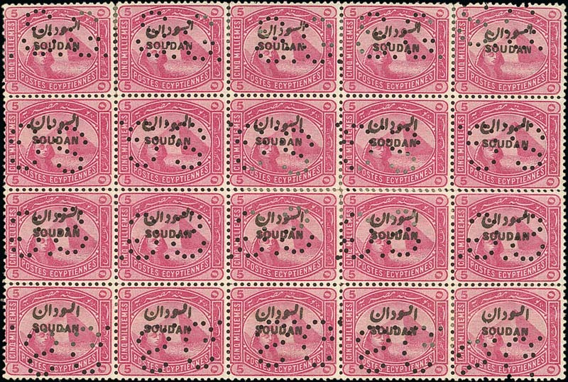 — 5m. rose-carmine block of twenty (5x4), the first row Type I with punctures normal the second row Type II with punctures inverted and reversed, the third Type III with punctures reversed and the fourth Type IV with punctures inverted, a little creased and some split perfs. The largest recorded multiple of which two exist. S.G. O1, £1200. Photo