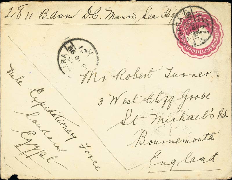1898 Sudan 5m. stationery envelope to Bournemouth, headed "2811 BASM D.G. Munro Sea Highlrs", cancelled by Atbara c.d.s. and showing, on reverse, Wadi Halfa and arrival datestamps; some small faults