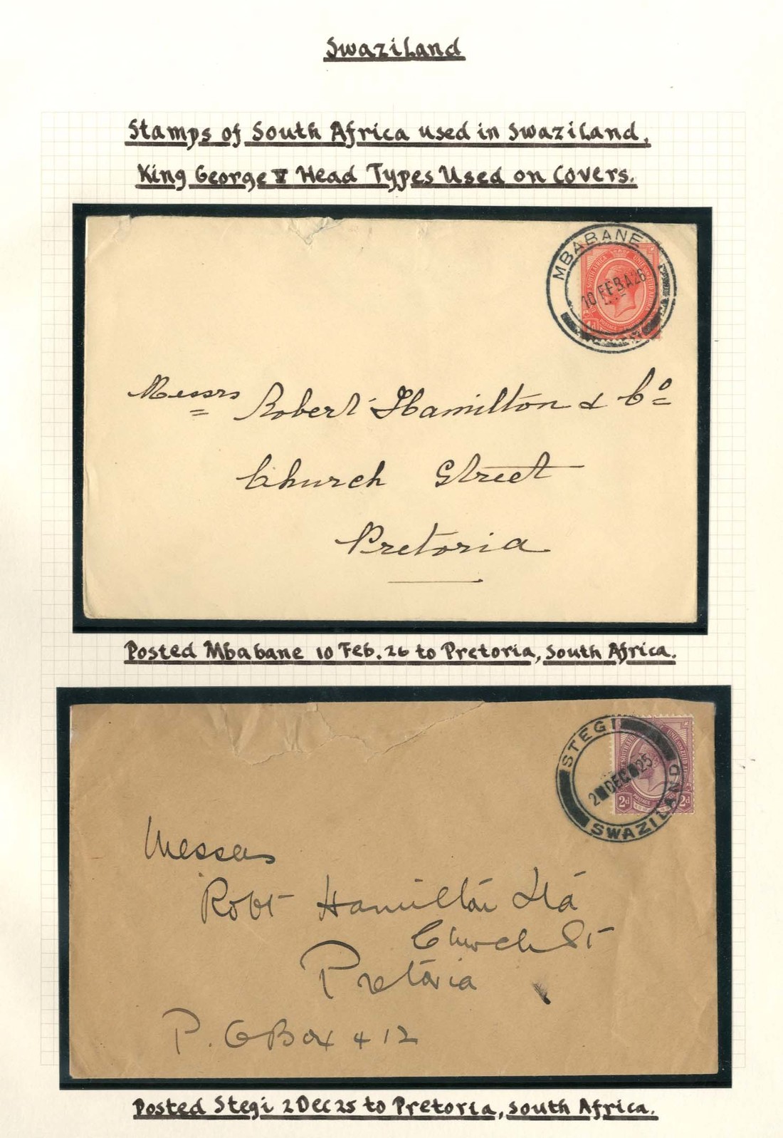 1925 envelope from Stegi to Pretoria bearing 1913 2d., 1926 envelope from Mbabane to Pretoria bearing 1913 1d., 1932 envelope from Mbabane to Johannesburg bearing 1910 2½d. and 1932 envelope registered from Mbabane to Pretoria bearing 1913 2d. marginal strip of four with inverted watermark; generally fine strikes